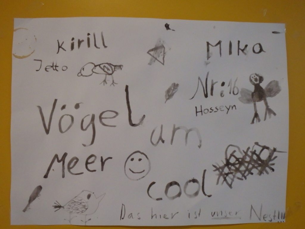 Nachdem unsere kleinen Forscher ihre „Vogelnester“ bezogen hatten, sollte auch ein entsprechendes Türschild gebastelt werden und dabei wurde die Tinte natürlich selber hergestellt! Aus Galläpfeln und Eisensalz entstand in einer chemischen Reaktion mit Sauerstoff Eisengallustinte – mit solch einer Tinte hatte schon Beethoven seine Partituren geschrieben! Stilecht wurde dann natürlich auch mit einem angespitzten Federkiel geschrieben. Falls also zukünftig mal keine Tinte  im Hause ist, so wissen unsere Entdecker vielfältige Wege, um diese selber herzustellen – zum Beispiel aus schwarzem Tee! Anschließend ging es dann zusammen mit „Nils Holgerson“  auf Reisen….dabei wuchsen auch der Phantasie unserer Entdecker Flügel….doch erst einmal „Gute Nacht“!